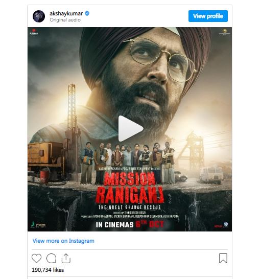 अक्षय कुमार ने कैप्शन लिखा है, ‘1989 में एक व्यक्ति ने कई परिस्थितियों को चुनौती दी है! #MissionRaniganj का ट्रेलर सोमवार, 25 सितंबर को आएगा। 6 अक्टूबर को सिनेमाघरों में #MissionRaniganj के साथ भारत के सच्चे नायक की कहानी देखने को मिलने वाली है!’
