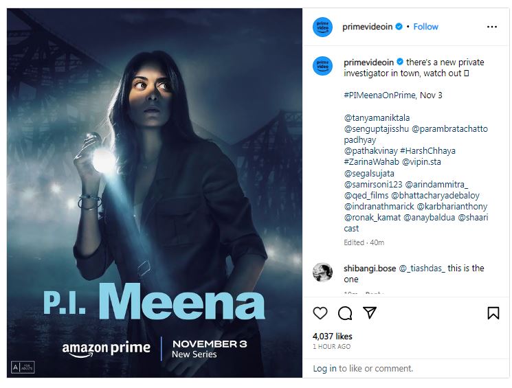 अरिंदम मित्रा द्वारा निर्मित पी.आई. मीना (P.I. Meena) के डायरेक्टर देबालोय भट्टाचार्य हैं, जिसमें तान्या मानिकतला ने मुख्य भूमिका निभाई है, जबकि परमब्रत चट्टोपाध्याय, जिशु सेनगुप्ता, विनय पाठक और ज़रीना वहाब ने भी बेहद अहम किरदार निभाए हैं। भारत के साथ-साथ दुनिया भर के 240 देशों और क्षेत्रों में 3 नवंबर को हिंदी, तमिल, तेलुगु, मलयालम और कन्नड़ में आठ-एपिसोड की इस सीरीज़ का प्रीमियर होगा। ‘पी.आई. मीना’ प्राइम मेंबरशिप में शामिल की गई सबसे नई सीरीज़ है। भारत में प्राइम मेंबर्स सालाना सिर्फ ₹1499 की मेंबरशिप लेकर खरीदारी पर बचत, ढेर सारी सुविधाओं और मनोरंजन का आनंद लेते हैं।