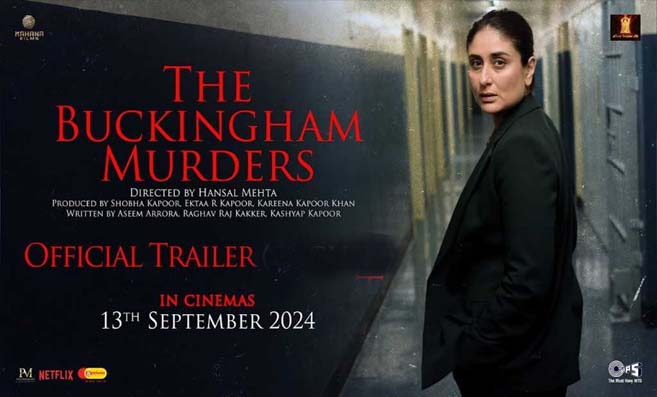 द बकिंघम मर्डर्स 13 सितंबर 2024 को सिनेमाघरों में रिलीज होगी। इस फिल्म में करीना कपूर खान, ऐश टंडन, रणवीर बरार और कीथ एलन जैसे टैलेंटेड स्टार्स हैं। ये फिल्म हंसल मेहता ने डायरेक्ट की है और असीम अरोड़ा, कश्यप कपूर और राघव राज कक्कड़ ने लिखी है। यह महाना फिल्म्स और टीबीएम फिल्म्स का प्रोडक्शन है, जिसे बालाजी टेलीफिल्म्स द्वारा प्रेजेंट की गई है। फिल्म को शोभा कपूर, एकता आर कपूर और पहली बार प्रोड्यूसर बन रही करीना कपूर खान ने प्रोड्यूस किया है।