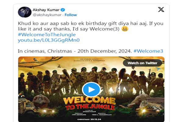 बता दें कि जहाँ जन्मदिन के मौके पर मौके पर अक्षय को फैंस जमकर बधाई दे रहे हैं, वहीं अक्षय कुमार ने भी अपने जन्मदिन के मौके आज फिल्म वेलकम टू द जंगल (Welcome 3 Teaser) की घोषणा कर ट्रीट दी है। अक्षय कुमार की फिल्म वेलकम टू द जंगल का ऐलान खास अंदाज में किया गया है। इस फिल्म के टीजर अनाउंसमेंट में कई बॉलीवुड कलाकार नजर आ रहे हैं
