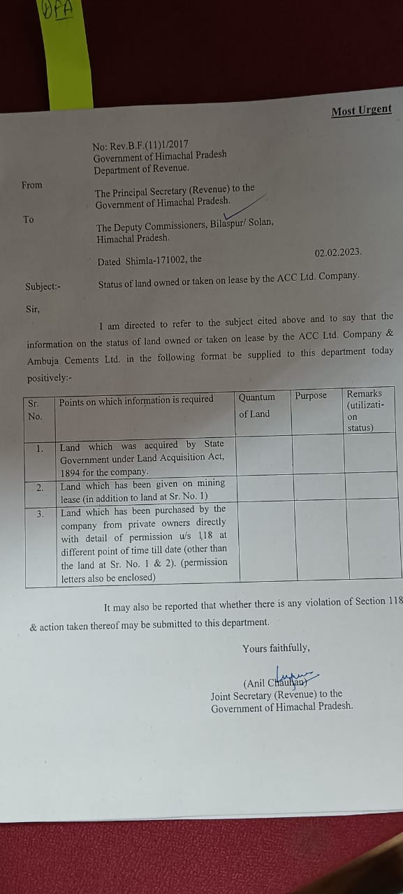 उल्लेखनीय है कि हिमाचल प्रदेश के बिलासपुर जिला में अदानी समूह के एसीसी सीमेंट प्लांट, जबकि सोलन जिला के अर्की दाडलाघाट में दो,और नालागढ़ में एक सीमेंट प्लांट है।