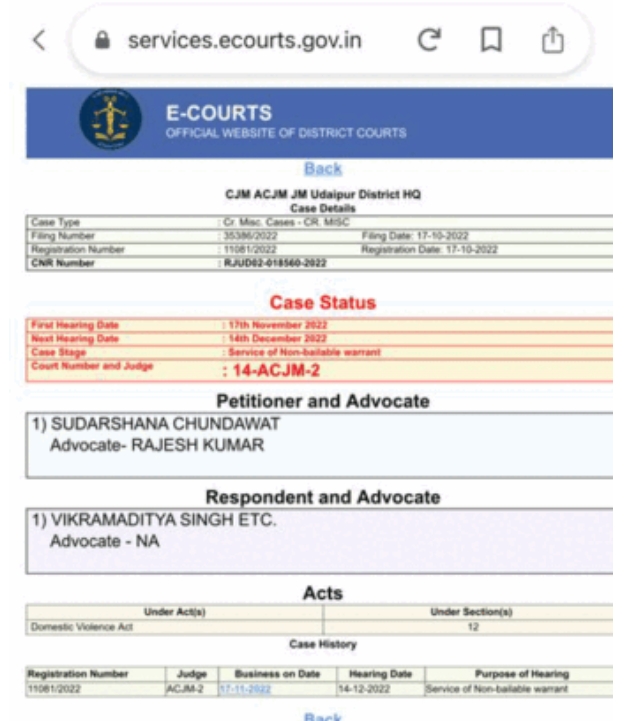 एनबीडब्ल्यू की सेवाओं के लिए कल एसीजेएम जिला अदालत, उदयपुर के समक्ष मामला तय किया गया था। शिमला ग्रामीण से विधायक की पत्नी ने 17 अक्टूबर को घरेलू अधिनियम की धारा 12 के तहत आपराधिक मामला दर्ज कराया था। यह मामला 17 नवंबर, 2022 को सुनवाई के लिए भी सूचीबद्ध किया गया था। कोर्ट ने गैर जमानती वारंट की सेवा के लिए कल मामले में सुनवाई तय की थी। विक्रमादित्य सिंह और अन्य को आपराधिक मामलों में आरोपी बनाया गया है।