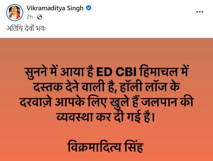 विक्रमादित्य सिंह ने अपने वीरवार सुबह फेसबुक पेज पर एक पोस्ट डाली। इसमें लिखा ‘सुनने में आया है ईडी, सीबीआइ हिमाचल में दस्तक देने वाली है, हालीलाज के दरवाजे आपके लिए खुले हैं। जलपान की व्यवस्था कर दी गई है’, अतिथि देवो भवः। चुनावी मौसम में इस पोस्ट की राजनीतिक गलियारों में खूब चर्चा हो रही है। इस पोस्ट के मायने जो भी हों, लेकिन चुनावी आहट के बीच इसने लोगों का ध्यान खींचा है।