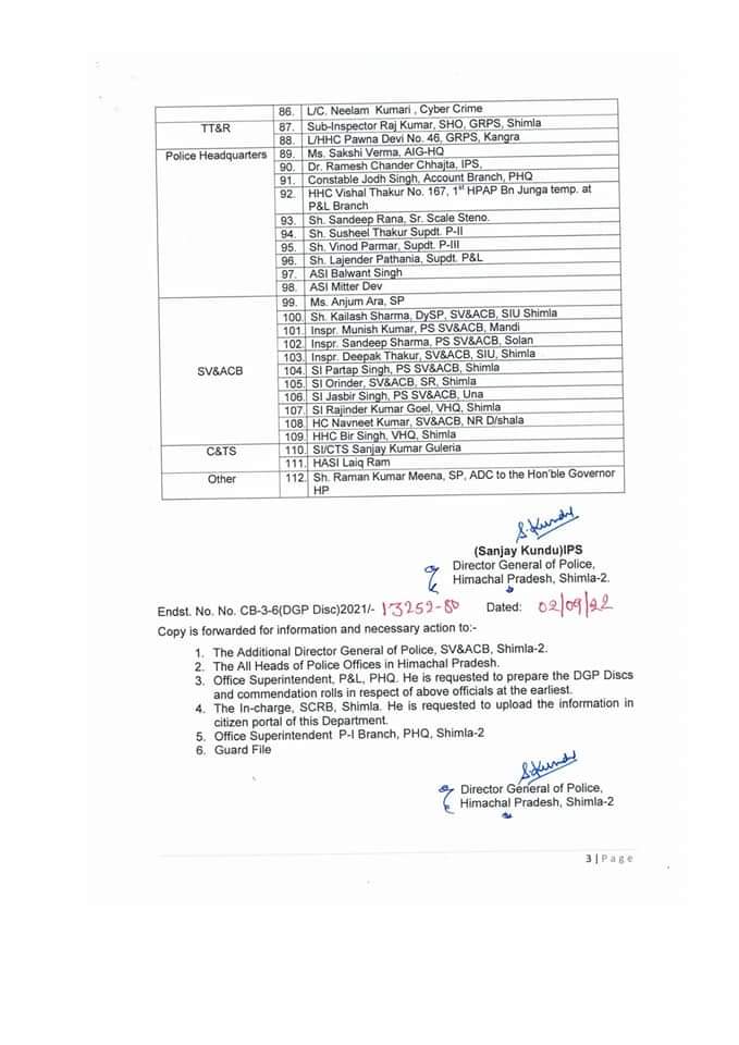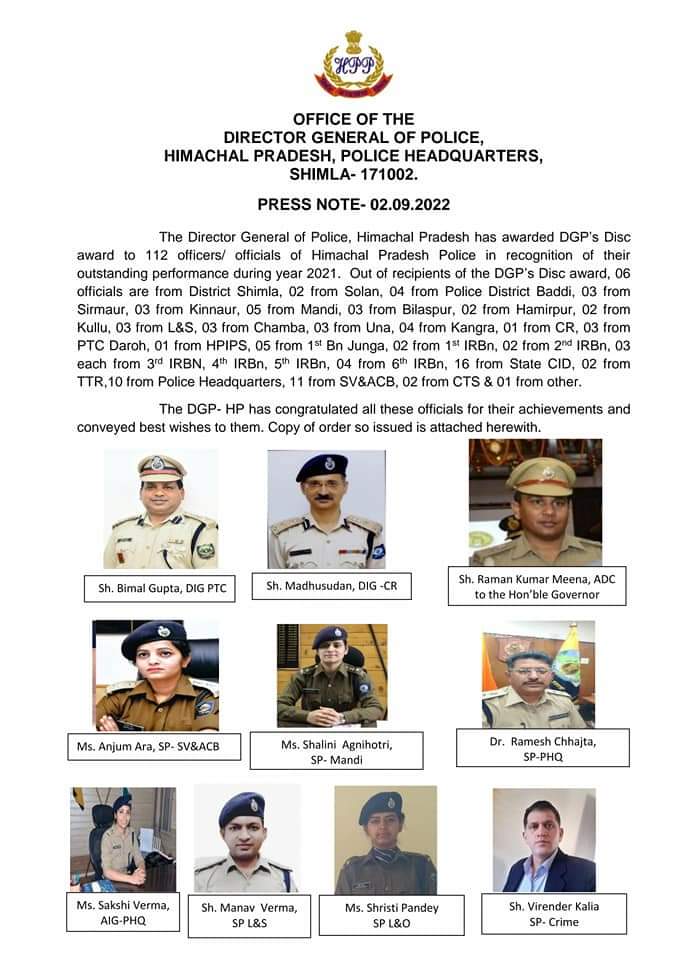 हिमाचल प्रदेश पुलिस मुख्यालय ने वर्ष 2021 के दौरान उत्कृष्ट कार्य करने वाले पुलिस अधिकारियों और कर्मचारियों को डीजीपी डिस्क अवार्ड से सम्मानित किया गया। पुलिस विभाग में उत्कृष्ट कार्य करने के लिए 112 अधिकारियों और कर्मचारियों को डीजीपी डिस्क अवार्ड से सम्मानित किया गया। इसमें 97 पुरुष और 15 महिला पुलिस अधिकारी और कर्मचारी शामिल है। पुलिस महानिदेशक संजय कुंडू ने साल 2021 के दौरान किए उत्कृष्ट कार्य के लिए यह अवार्ड दिए है।