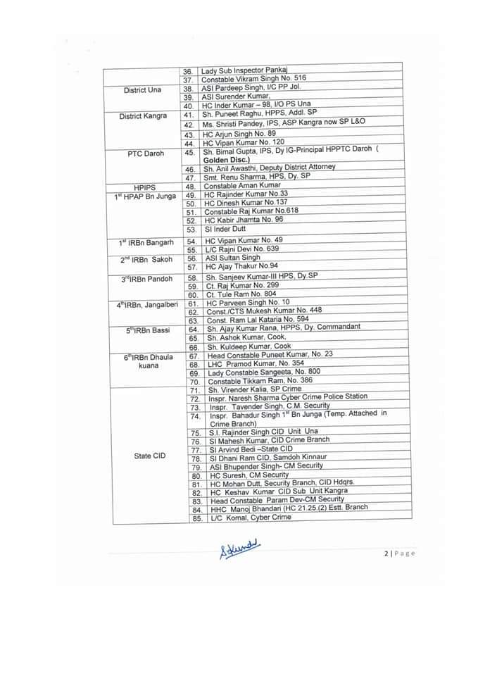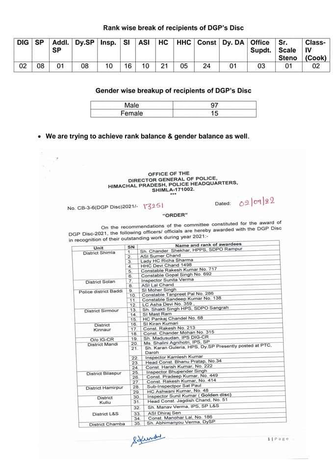 डीजीपी डिस्क अवार्ड के लिए जिला शिमला से छह अधिकारी, सोलन से दो, पुलिस जिला बद्दी से चार, सिरमौर से तीन, किन्नौर से तीन, मंडी से पांच, बिलासपुर से तीन, हमीरपुर से दो, कुल्लू से दो, लाहुल-स्पीति से तीन, चंबा से तीन, ऊना से तीन, कांगड़ा से चार, सीआर से एक, पीटीसी डरोह से तीन, एचपीआइपीएस से एक, एसटीबीएन जुन्गा से पांच, पहली आइआरबीएन-एक से दो, आइआरबीएन-दो से दो, आर्ईआरबीएन-तीन, चार व पांच से तीन-तीन, आइआरबीएन-छह से चार, सीआइडी एक से छह, टीटीआर से दो, पुलिस मुख्यालय से 10, विजिलेंस से 11 और सीटीएस से दो और अन्य का चयन हुआ है।