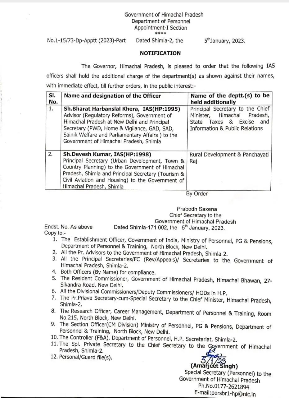 हिमाचल सरकार ने भरत खेड़ा को मुख्यमंत्री सुखविंदर सिंह सुक्खू के प्रधान सचिव का अतिरिक्त कार्यभार सौंपा है। साथ ही उन्हें सरकार ने सूचना एवं जनसंपर्क और राज्य कर एवं आबकारी विभाग की भी जिम्मेदारी सौंपी है। खेड़ा प्रधान सचिव लोक निर्माण विभाग, गृह, विजिलेंस, जीएडी, एसएडी, सैनिक कल्याण,संसदीय मामले विभाग के साथ सलाहकार विनियामक सुधार के पद पर सेवाएं दे रहे हैं।