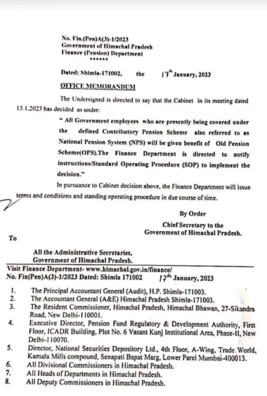 मुख्यमंत्री सुखविंदर सिंह सुक्खू की अध्यक्षता में गत 13 जनवरी को लोहड़ी पर्व के दिन हुई मंत्रिमंडल की पहली बैठक में पुरानी पैंशन योजना को बहाल करने के निर्णय के बाद अब वित्त विभाग की तरफ से एसओपी को तैयार करने के बाद पुरानी पैंशन बहाली से संबंधित अधिसूचना को जारी कर दिया जाएगा।