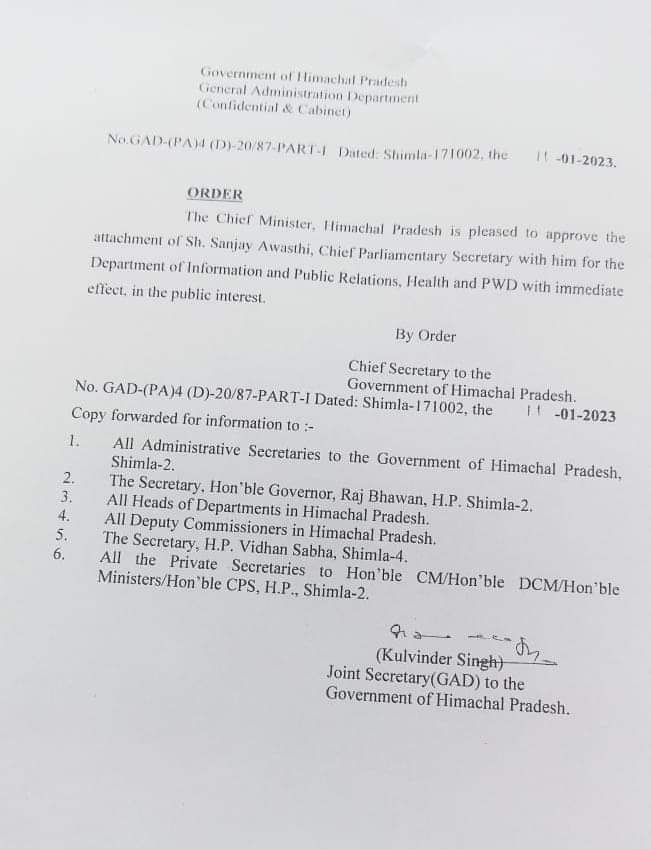 इससे पहले बुधवार को सुक्खू सरकार ने एक अधिसूचना जारी कर स्वास्थ्य, पीडब्ल्यूडी (PWD) और सूचना एवं जन संपर्क विभाग रहेगा का कार्यभार अपने पास ही रखा है। हालांकि इसके साथ सीपीएस संजय अवस्थी (CPS Sanjay Awasthi) को सीएम के साथ अटैच किया गया है।