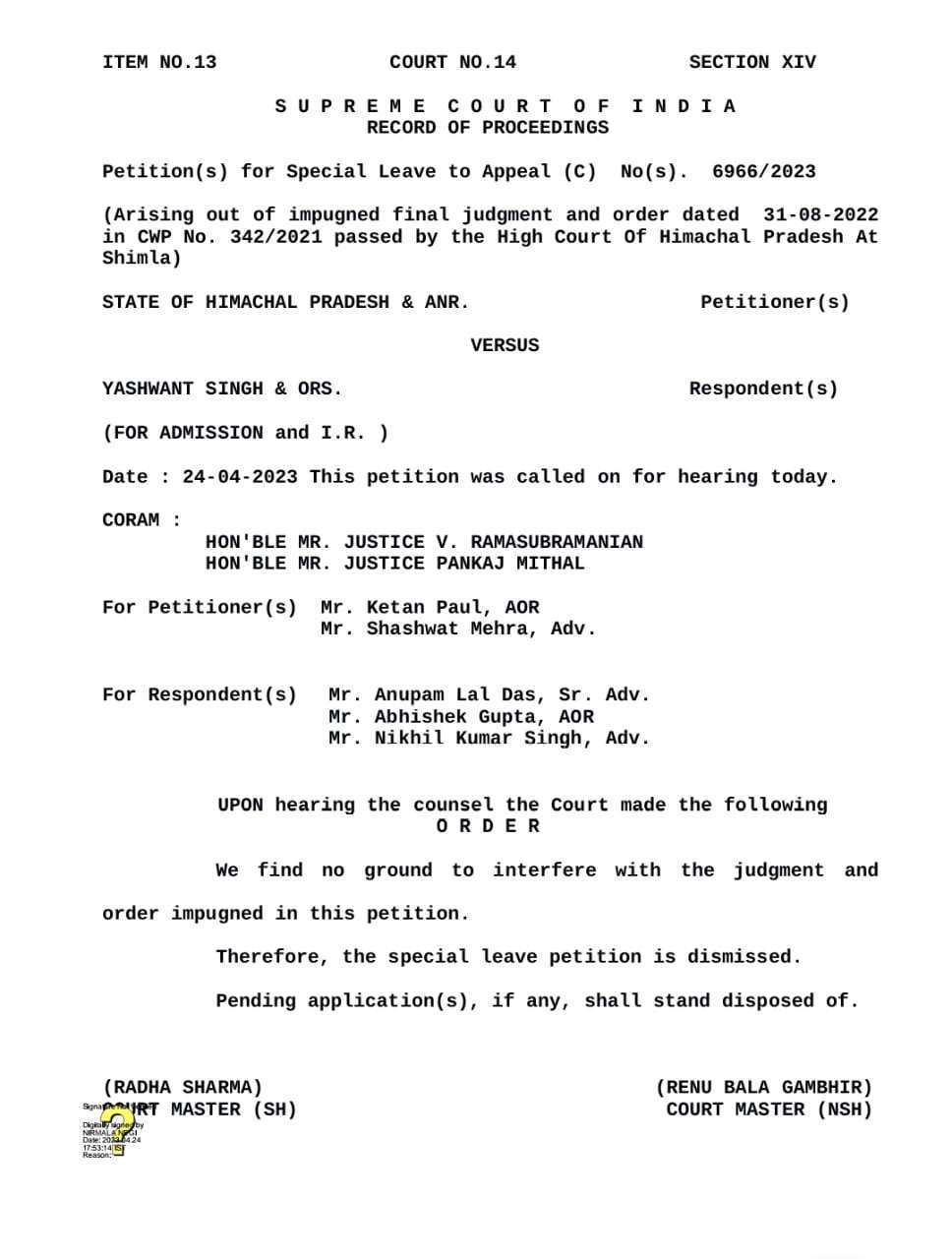 माननीय सुप्रीम कोर्ट ने प्रदेश सरकार की याचिका को ख़ारिज करते हुए वर्ष 2015 में अनुबंध में आए पीटीए शिक्षकों के पक्ष मे हिमाचल प्रदेश हाई कोर्ट के फैसले को सुरक्षित रखते हुए उनके 2018 से नियमितीकरण पर अंतिम मोहर लगा दी है। 24 अप्रैल 2023 को इस मामले की माननीय सर्वोच्च न्यायालय में सुनवाई हुई और दोनों पक्षों को सुनने के बाद माननीय सर्वोच्च न्यायालय ने हिमाचल हाई कोर्ट द्वारा 5100 अनुबंध पीटीए शिक्षकों के पक्ष में 2018 से नियमितीकरण के फैसले को बरकरार रखा और इस मामले के विरुद्ध सरकार की याचिका को ख़ारिज कर दिया।