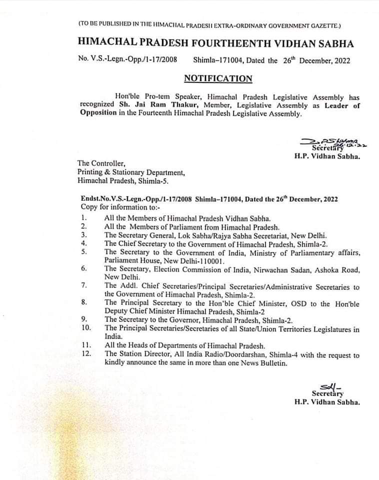 हिमाचल प्रदेश के पूर्व मुख्यमंत्री जयराम ठाकुर विधानसभा में विपक्ष के नेता होंगे। हिमाचल प्रदेश विधानसभा के प्रोटेम स्पीकर ने विधायक जयराम ठाकुर को विधानसभा में विपक्ष के नेता के रूप में मान्यता दी है। इससे पहले जयराम ठाकुर को राज्य में बीजेपी विधायक दल का नेता चुना गया था। बीजेपी विधायक दल की बैठक में सर्वसम्मति से जयराम ठाकुर को नेता चुने जाने के बाद उन्होंने कहा था कि, बीजेपी परिवार की हर जिम्मेदारी को प्राथमिकता से निभाना हमारी प्रतिबद्धता है।
