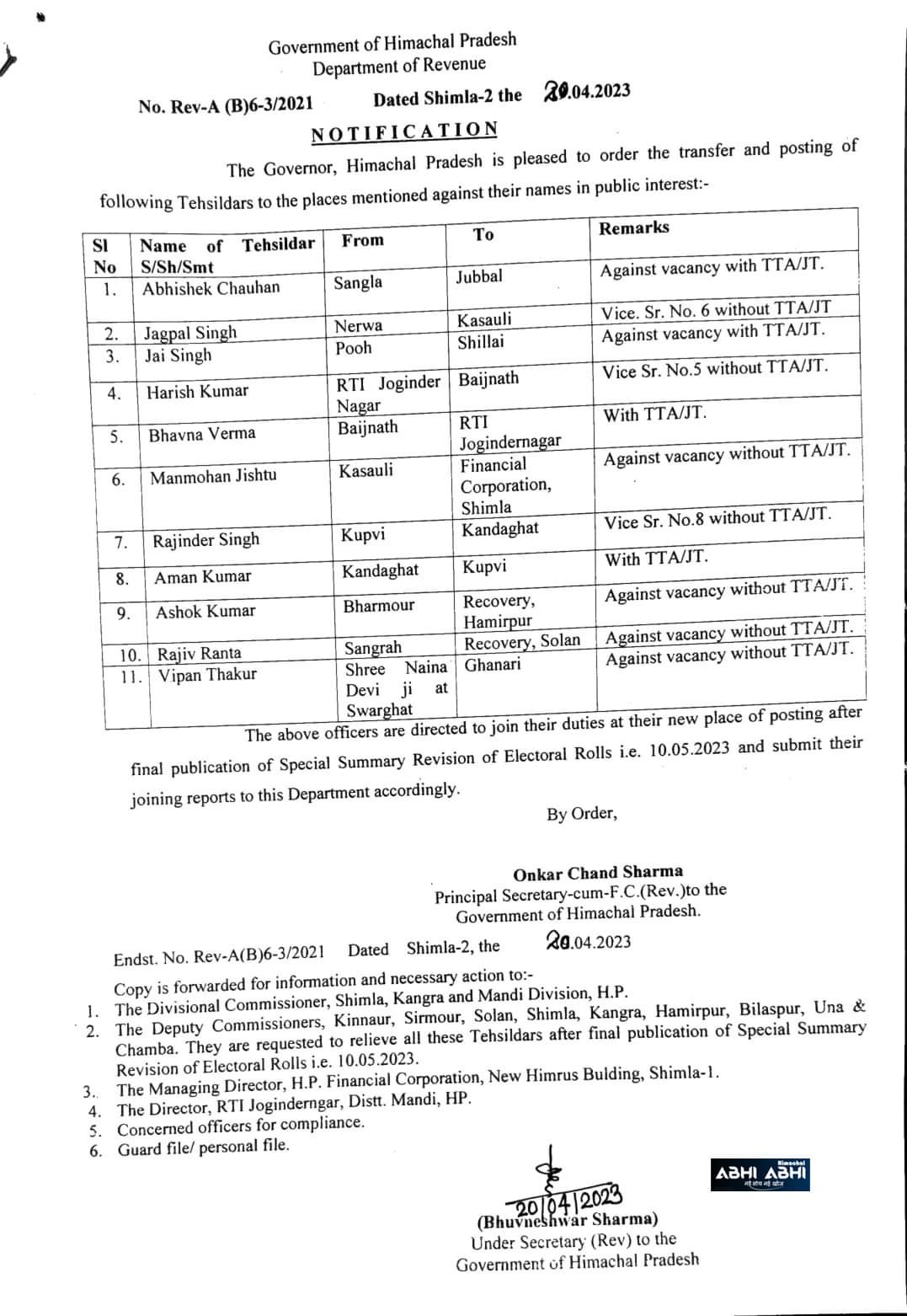 हिमाचल में 11 तहसीलदारों के तबादला आदेश जारी