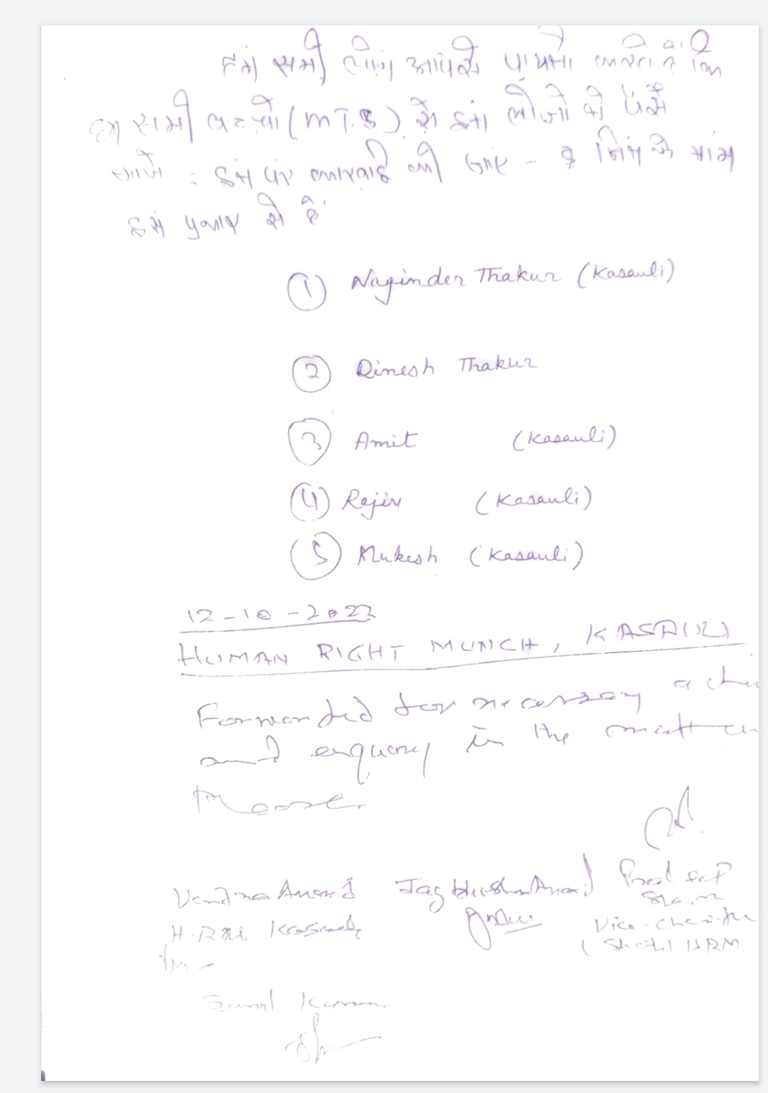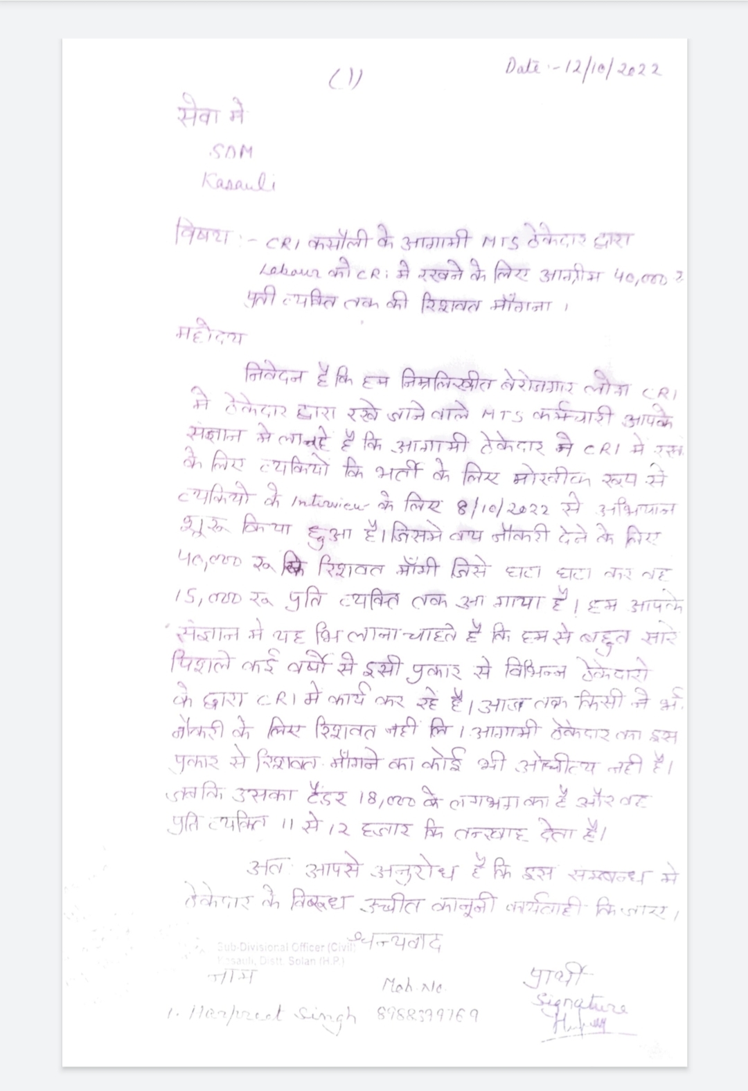 पुराने कर्मियों ने कहा कि उन्हें कहा जा रहा है कि यदि पैसे नहीं देने है तो घर जाओ। नौकरी के लिए अनेकों लोग हजारों रुपए लेकर खड़े है। दर्जनों कर्मियों ने इसकी शिकायत एसडीएम कसौली धनबीर ठाकुर को दी, जिस पर उन्होंने मामला कसौली पुलिस व सीआरआई की निदेशक को भेज दी है। उन्होंने कहा कि उन्होंने ठेकेदार से भी शिकायत बारे बात की तो उसने सभी आरोपों को नकार दिया।