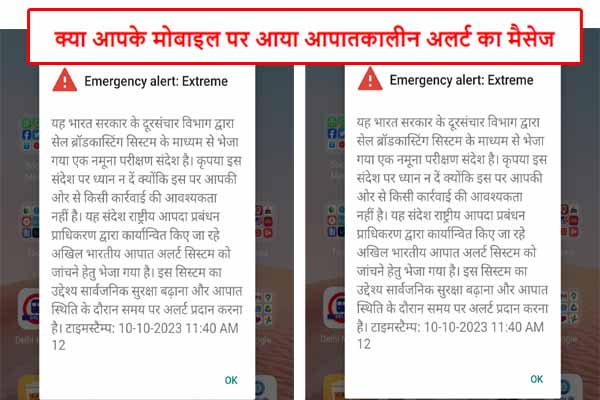 भारत सरकार द्वारा एक इमरजेंसी अलर्ट सिस्टम (Emergency Alert System) तैयार किया जा रहा है। यह संदेश उसी सिस्टम के परीक्षण का हिस्सा है। परीक्षण पूरा होने तक ऐसे संदेश टेस्ट के तौर पर आते रहेंगे ताकि बेहतरीन और सटीक तरीके इसका आंकलन किया जा सके।