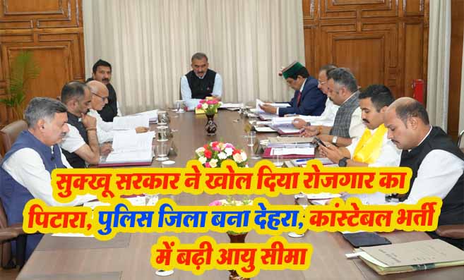 Himachal Cabinet Decision: मुख्यमंत्री सुखविंदर सिंह सुक्खू की अध्यक्षता में आज यहां प्रदेश मंत्रिमण्डल की बैठक में पुलिस विभाग में आरक्षी (कांस्टेबल) के 1226 पदों पर भर्ती के लिए उम्मीदवारों की अधिकतमत आयु सीमा में एक वर्ष की छूट देने को स्वीकृति प्रदान की गई। इस छूट के साथ अब सामान्य वर्ग के उम्मीदवार 18 से 26 वर्ष की आयु तक, अनुसूचित जाति/अनुसूचित जनजाति, अन्य पिछड़ा वर्ग, गोरखा, प्रतिष्ठित खिलाड़ी 18 से 28 वर्ष तक और होमगार्ड 20 से 29 वर्ष की आयु तक पुलिस विभाग में कांस्टेबल पद की भर्ती के लिए पात्र होंगे।