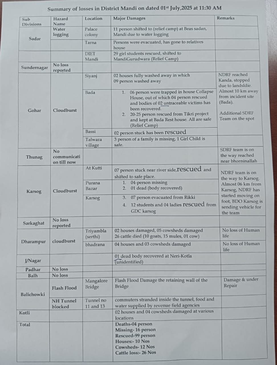 प्रशासन और स्थानीय लोग मिलकर राहत कार्यों में जुटे हैं। प्रभावित इलाकों में लोगों को सुरक्षित स्थानों पर पहुंचाया जा रहा है, और राहत सामग्री वितरित की जा रही है। हालांकि, बारिश का सिलसिला थमने का नाम नहीं ले रहा, जिससे चुनौतियां और बढ़ रही हैं। इस आपदा ने न केवल संपत्ति को नुकसान पहुंचाया, बल्कि कई परिवारों को अपनों से दूर कर दिया। प्रशासन से मिली जानकारी के मुताबिक अभी तक चार लोगों की मौत हो चुकी है 16 लोग अभी भी लापता है।