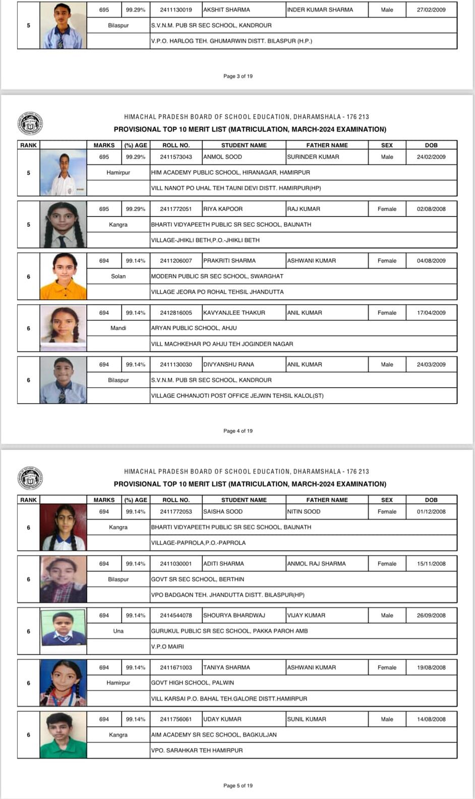 वहीँ दसवीं कक्षा की मेरिट में राजकीय वरिष्ठ माध्यमिक पाठशाला कन्या नादौन की छात्रा रिद्धिमा शर्मा ने हिमाचल प्रदेश प्रथम स्थान हासिल किया है। रिद्धिमा शर्मा ने 700 में 699 यानी 99.86 प्रतिशत अंक हासिल किए हैं। रिद्धिमा शर्मा ने सफलता का श्रेय अपने माता-पिता और गुरुजनों को दिया है। उन्होंने कहा कि वह डॉक्टर बनना चाहती हैं। रिद्धिमा ने 11वीं कक्षा में मेडिकल संकाय में प्रवेश लिया है।