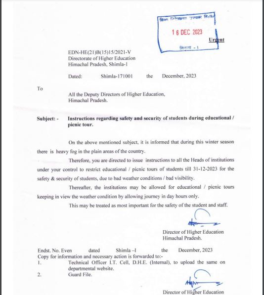 निदेशक उच्चतर शिक्षा विभाग डॉ. अमरजीत शर्मा ने इस संबंध में सभी जिलों के उप निदेशक व स्कूल प्रधानाचार्यों को सर्कुलर जारी कर दिया है। आदेशों में कहा गया है कि जहां पर बच्चों को पिकनिक पर ले जाया जा रहा है वहां के मौसम का पहले पता कर लें। वहां सड़कों की स्थिति कैसी है इसे भी पहले सुनिश्चित कर लें। जहां पर बच्चों को पिकनिक पर ले जाया जा रहा है वहां के मौसम का पहले पता कर लें। वहां सड़कों की स्थिति कैसी है इसे भी पहले सुनिश्चित कर लें।