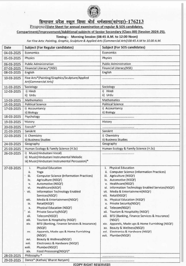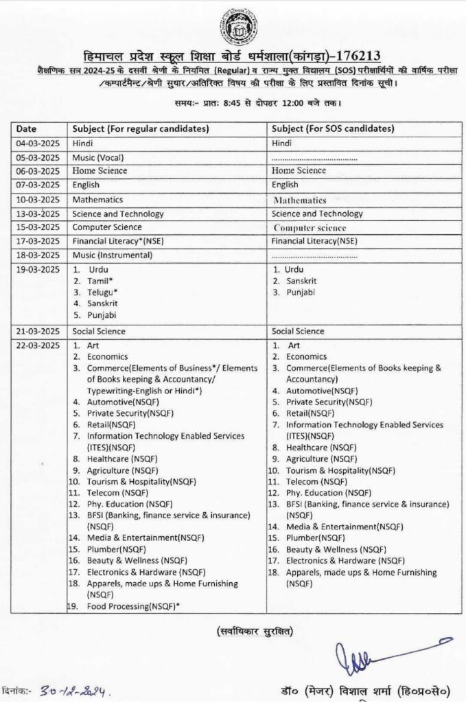 HPBOSE Date Sheet 2025: हिमाचल प्रदेश बोर्ड ऑफ स्कूल एजुकेशन (HPBOSE) ने 10वीं और 12वीं कक्षाओं के लिए आगामी बोर्ड परीक्षाओं की डेट शीट जारी कर दी है। छात्र इसे बोर्ड की आधिकारिक वेबसाइट hpbose.org से देख और डाउनलोड कर सकते हैं।