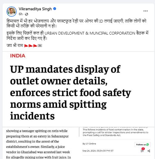 विक्रमादित्य ने अपनी फ़ेसबुक पोस्ट में लिखा है कि “हिमाचल में भी हर भोजनालय और फास्टफूड रेड़ी पर ओनर की आईडी लगाई जाएगी, ताकि लोगों को किसी भी तरीक़े की परेशानी न हो। इसके लिए पिछलें कल ही निर्देश जारी कर दिए गए हैं।”
