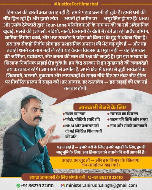अनिरुद्ध सिंह ने हिमाचल वासियों से एकजुट होकर जन-आंदोलन खड़ा करने का आह्वान किया है। उन्होंने कहा, “अब हिमाचल को बचाने की बारी आपकी है। अपने क्षेत्र में NHAI से जुड़ी शिकायतें, घटनाएं, नुकसान और लापरवाही के साक्ष्य चाहे वीडियो, फोटो या दस्तावेज निर्धारित प्रारूप में साझा करें।” इसके लिए उन्होंने एक समर्पित नंबर +9186279 22410 और ईमेल minister.anirudh.singh@gmail.com जारी किया है, जहां लोग अपनी शिकायतें भेज सकते हैं।”हर आवाज़, हर दस्तावेज़ बनेगा हथियार”