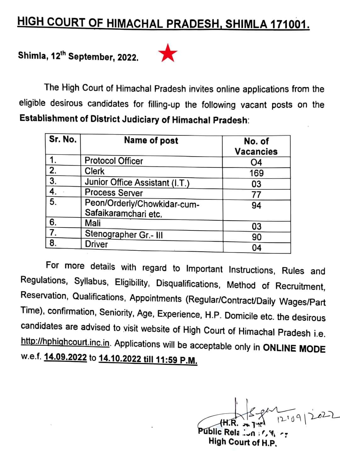 जानकारी के अनुसार, अभ्यर्थियों को 14 सितंबर से 14 अक्टूबर 2022 तक ऑनलाइन आवेदन करने होंगे। विज्ञापन में साफ लिखा गया है कि इन पदों के लिए सिर्फ ऑनलाइन आवेदनों को ही मंजूर किया जाएगा। ऑफलाइन आवेदन मंजूर नहीं किए जाएंगे। इन पदों के लिए शैक्षणिक योग्यता, आयु, फीस और अन्य योग्यता की जानकारी हाईकोर्ट की वेबसाइट http:/hphighcourt.nic.in पर दी गई है।
