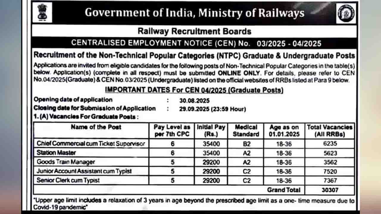 रेलवे भर्ती बोर्ड (RRB) की ओर जारी नोटिफिकेशन मुताबिक, टाइपिस्ट, स्टेशन मास्टर जैसे 30307 पद भरे जाएंगे। इस बारे में नोटिफिकेश जारी कर दिया गया है। कैंडिडेट्स को किसी मान्यता प्राप्त विश्वविद्यालय या समकक्ष से स्नातक उत्तीर्ण होना जरूरी है। इस रेलवे भर्ती (Railway Recruitment 2025) के लिए इच्छुक कैंडिडेट्स 29 सितंबर 2025 तक ऑनलाइन अप्लाई कर सकते हैं।