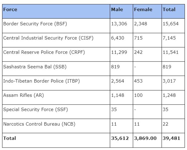 विभिन्न केंद्रीय सशस्त्र पुलिस बलों (सीएपीएफ) और अर्धसैनिक संगठनों के लिए कुल 39,481 रिक्तियों की घोषणा की गई है।
