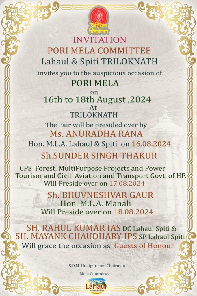 त्रिलोकनाथ अर्थात् तुन्दे नगरी में मनाया जाने वाला पोरि मेला जनजातीय ग्रामीण संस्कृति की सम्पूर्णता का दिग्दर्शन कराता है। राणावंश के हामिर बर्धाइम द्वारा शिव व पार्वती के विवाह की स्मृति में त्रिलोकनाथ को समर्पित यह पावन मेला श्रावण मास के अंत में शुरू हो कर भाद्रपद मास के प्रथम या द्वितीय रविवार को संध्या के समय नुआला अनुष्ठान के साथ संपन्न हो जाता है। तीन दिनों तक चलने वाले इस पोरि मेले के पूर्व ही अस्थाई दुकाने सज जाती हैं। मेले में विभिन्न सांस्कृतिक कार्यक्रमों के साथ साथ खेल कूद प्रतियोगिताओं का भी आयोजन किया जाता है, जिसमें खेल प्रेमी बढ़-चढ़ कर उत्साहपूर्वक भाग लेते हैं। इस बीच एक शोभा यात्रा निकाली जाती है जो देव वा‌यों की घन गर्जना के साथ मंदिर की परिक्रमा करते हैं।
