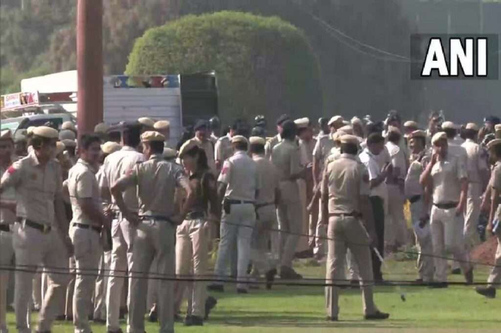 #WATCH | Delhi: Police make announcements at Vijay Chowk and inform the marching Opposition MPs to not march ahead as Section 144 CrPC is imposed and no agitation is allowed here.