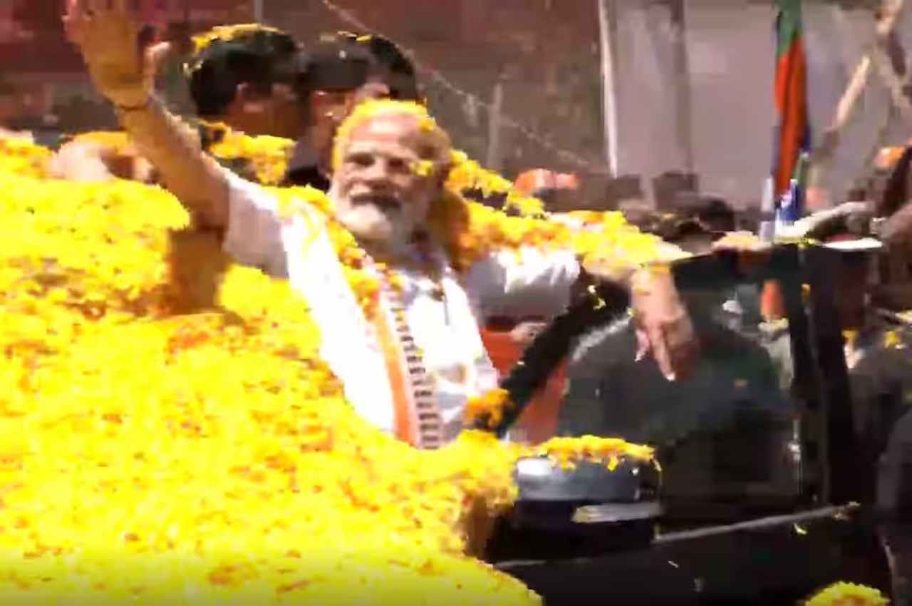 #WATCH | PM Narendra Modi showered with flowers by BJP supporters and locals as he holds road show in Mandya, Karnataka
