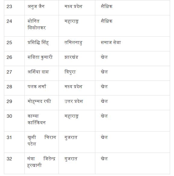 पुरस्कार से सम्मानित होने वाले बच्चे 21 राज्यों/केन्द्र शासित प्रदेशों के 32 ज़िलों से आते हैं। कला एवं संस्कृति के क्षेत्र में 7 पुरस्कार, नवाचार के क्षेत्र में 9 पुरस्कार और शैक्षिक उपलब्धियों के क्षेत्र में 5 पुरस्कार प्रदान किए गए हैं। वहीं दूसरी तरफ खेल की श्रेणी में 7 बच्चों को, बहादुरी के लिए 3 बच्चों को और समाज सेवा के क्षेत्र में बेहतर काम करने के लिए एक बच्चे को सम्मानित किया गया।