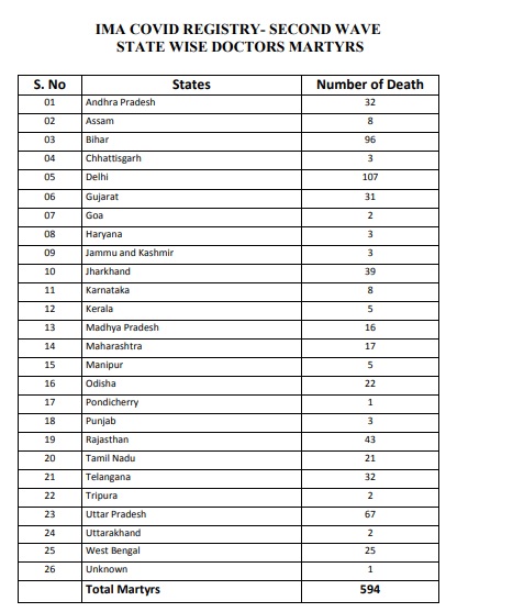 देश में कोरोनावायरस बीमारी (कोविड-19) महामारी की दूसरी लहर के दौरान 594 डॉक्टरों की मौत हो गई। इंडियन मेडिकल एसोसिएशन (IMA) ने बुधवार को भारत में मौतों को राज्यवार दर्शाने वाला एक चार्ट संगठन द्वारा प्रकाशित किया गया था और समाचार एजेंसी एएनआई द्वारा इसे सोशल मीडिया पर साझा किया गया था।