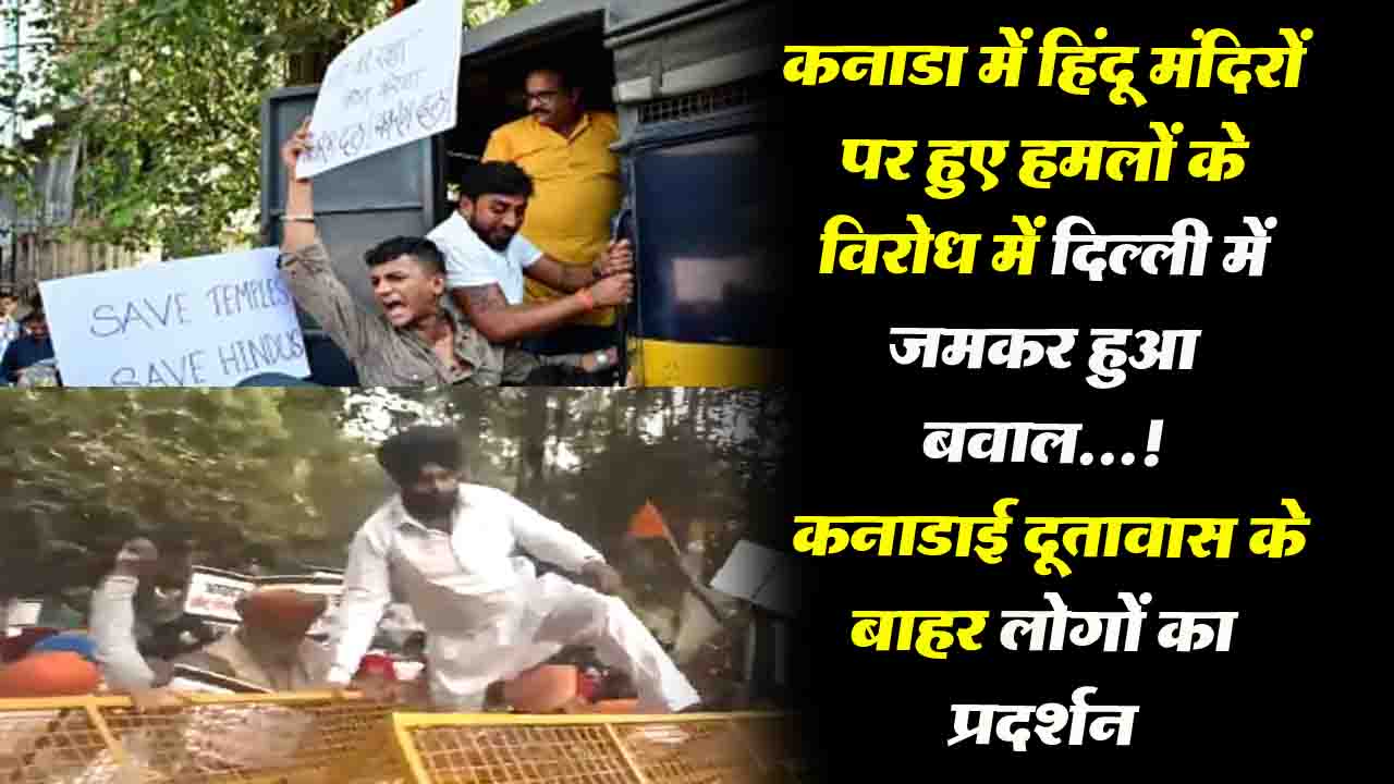 Delhi Protest : कनाडा में हिंदू मंदिरों पर हाल ही में हुए हमलों के विरोध में रविवार को दिल्ली में जमकर बवाल हुआ। हमलों के विरोध में दिल्ली में स्थित कनाडाई दूतावास के बाहर लोगों ने जमकर प्रदर्शन किया। इस दौरान प्रदर्शकारियों ने जमकर नारेबाजी भी की। पुलिस ने उन्हें काफी समझाने की कोशिश की, लेकिन वे नहीं मान रहे थे।
