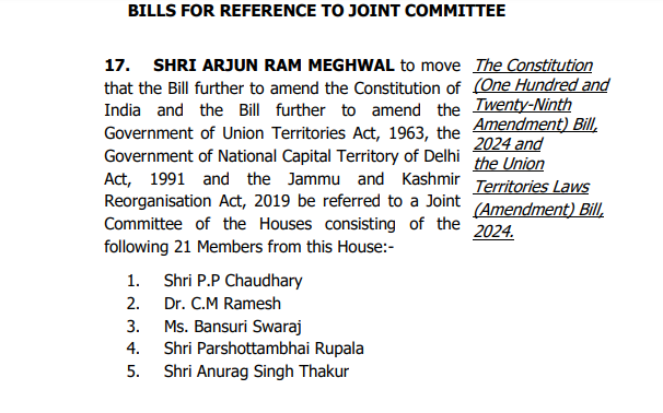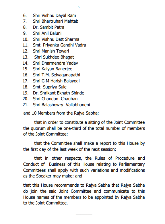 जेपीसी के सदस्य में प्रियंका गांधी वाड्रा, मनीष तिवारी, धर्मेंद्र यादव, कल्याण बनर्जी, सुप्रिया सुले, श्रीकांत एकनाथ शिंदे, संबित पात्रा, अनिल बलूनी, अनुराग ठाकुर जैसे प्रमुख नाम शामिल हैं। इसके अलावा, राज्यसभा सांसदों की भी समिति में भागीदारी होगी। जेपीसी इस बिल पर व्यापक विचार-विमर्श करेगी और पक्ष-विपक्ष के साथ-साथ विशेषज्ञों से चर्चा कर अपनी रिपोर्ट सरकार को सौंपेगी।