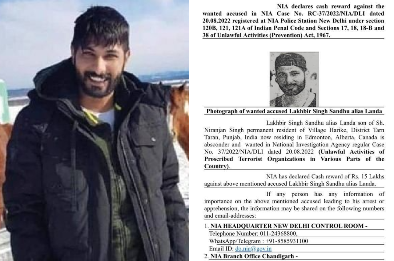 National Investigation Agency (NIA) today declared a cash reward of Rs 15 lakh against absconding terror accused Lakhbir Singh Sandhu alias Landa. A resident of Harike village in Punjab’s Tarn Taran district, Landa is currently residing in Edmonton, Alberta, Canada. pic.twitter.com/hBQraympFO
