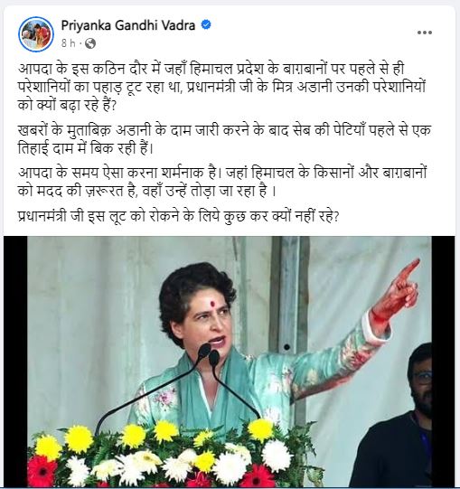 प्रियंका ने ट्वीट किया है कि, आपदा के इस कठिन दौर में जहां हिमाचल प्रदेश के बाग़बानों पर पहले से ही परेशानियों का पहाड़ टूट रहा था, प्रधानमंत्री जी के मित्र अडानी उनकी परेशानियों को क्यों बढ़ा रहे हैं?”