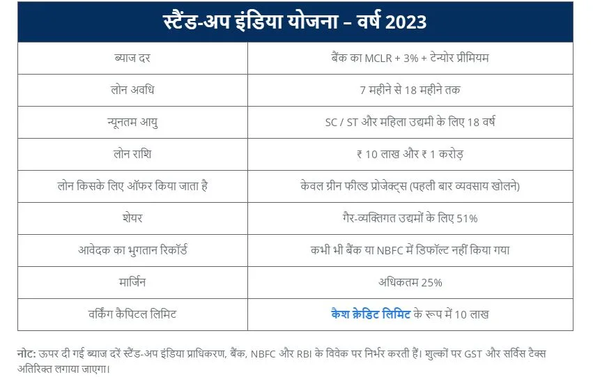 स्टैंड-अप इंडिया ने हमेशा आर्थिक सशक्तीकरण को बढ़ावा देने के लिए काम किया है और रोजगार के अवसर बनाने में मदद की है। यह योजना देश भर में स्थित 1.25 लाख बैंक शाखाओं के माध्यम से न्यूनतम 2.5 लाख उधारकर्ताओं को लाभ पहुंचाने के लिए काम करती है। यह योजना SC / ST वर्ग के उद्यमियों और महिला उद्यमियों को क्रेडिट गारंटी, हैंड होल्ड सपोर्ट और फाइनेंस पर जानकारी प्रदान करने के लिए एक डिजिटल प्लेटफॉर्म प्रदान करती है। इस योजना के तहत दी जाने वाली अतिरिक्त सेवाएं उद्यमियों के लिए प्रशिक्षण, परामर्श, मार्गदर्शन और कौशल विकास कार्यक्रम हैं।