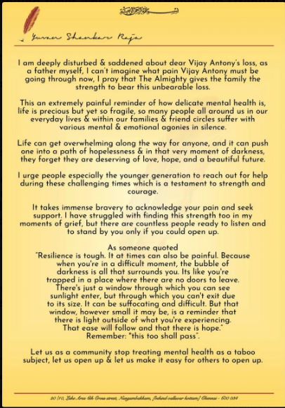 चेन्नई के संगीतकार युवान शंकर राजा ने मीरा को श्रद्धांजलि अर्पित करने के लिए सोशल मीडिया पर एक भावनात्मक पत्र साझा किया, जिसमें Vijay Antony के परिवार के प्रति संवेदना व्यक्त की गई।