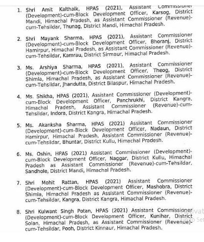 हिमाचल प्रदेश सरकार ने आठ एचएएस अधिकारियों के तबादला व तैनाती आदेश जारी किए हैं। शुक्रवार को कार्मिक विभाग की ओर से जारी तबादला आदेशों के तहत अमित कलथाइक को सहायक आयुक्त(राजस्व)-कम-तहसीलदार थुनाग मंडी, मयंक शर्मा कमरऊ सिरमौर, अर्शिया शर्मा झंडूता बिलासपुर, शिखा इंदौरा कांगड़ा, आकांक्षा शर्मा भुंतर कुल्लू, ओशिन संधोल मंडी, मोहित रत्न कांगड़ा व कुलवंत सिंह पोटन को पूह किन्नौर तैनात किया गया है। इस संबंध में मुख्य सचिव की तरफ से विशेष सचिव कार्मिक अमरजीत सिंह ने नियुक्ति आदेश जारी किए हैं।