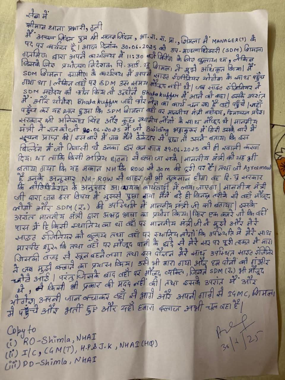 शिकायत के अनुसार यह घटना 30 जून, 2025 को भट्टाकुफर में हुई, जहां फोरलेन का निर्माण कार्य चल रहा है। जिंदल ने बताया कि उन्हें SDM शिमला ग्रामीण के कार्यालय में 11:30 बजे मीटिंग के लिए बुलाया गया था, लेकिन SDM वहां नहीं थे। इसके बाद उन्हें भट्टाकुफर बुलाया गया, जहां मंत्री और SDM मौजूद थे।
