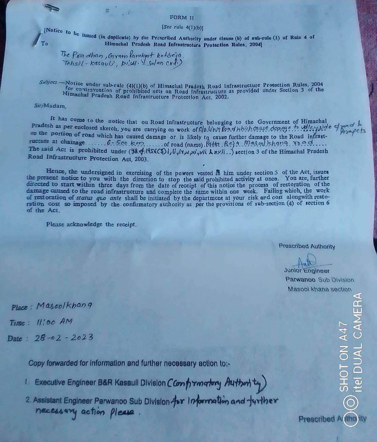 लेकिन प्रजासत्ता की न्यूज़ टीम के पास प्रधान कोटबेजा, सचिव और विकासखंड अधिकारी से बातचीत के समय के काल रिकार्डिंग का ऑडियो उपलब्ध है। जिसमें पंचायत सचिव का यह मानना की जेसीबी मशीन उसके परिवार की है। प्रधान का यह कहना कि विधायक निधि से आए पैसों की पहली क़िस्त से यह काम करवाएं जाना। और परिवारिक रिश्तों का हवाला देकर मामले को दबाने के लिए कहा जा रहा है। इतना ही नहीं इस मामले में लोक निर्माण विभाग हिमाचल ने भी अपनी संम्पति( पट्टा मासुलखाना रोड़) को नुकसान पहूँचाने के लिए पंचायत को नोटिस जारी किया है। जिसकी प्रति भी प्रजासत्ता न्यूज़ के पास उपलब्ध है। जिससे यह साफ जाहिर होता है कि पंचायत के द्वारा ही सचिव की पारिवारिक जेसीबी से यह काम करवाया जा रहा था।