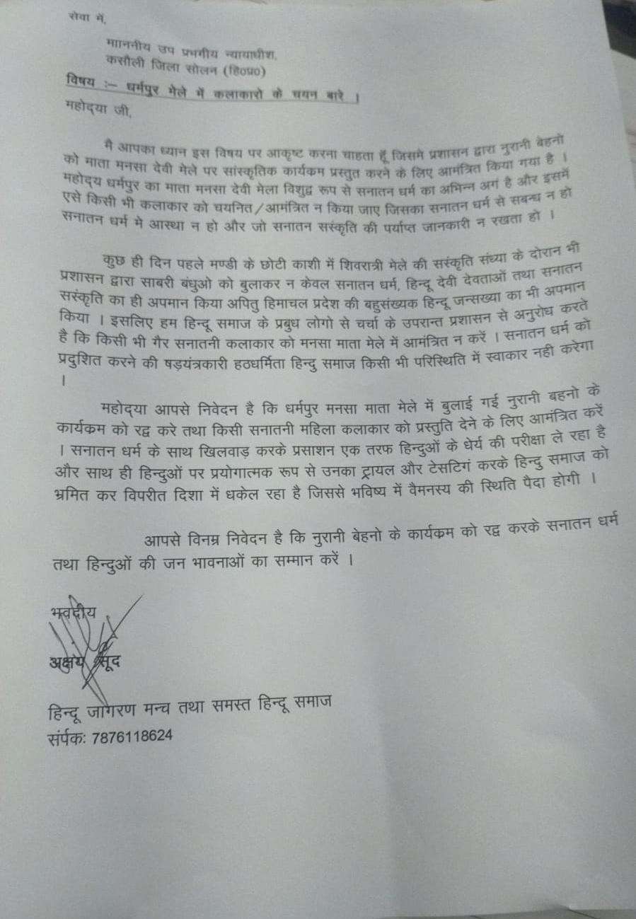 सोलन जिला के धर्मपुर में आयोजित होने वाले तीन दिवसीय जिला स्तरीय माता मनसा देवी मेले को लेकर प्रशासन ने तैयारियां शुरू कर दी है। इसी कड़ी में मेले में आयोजित होने वाले सांस्कृतिक कार्यक्रमों के लिए कलाकारों के चयन की प्रक्रिया शुरू होते ही एक विवाद शुरू हो गया। दरअसल हिन्दू जागरण मंच द्वारा मेले के आयोजन के दौरान नूरा बहनों को बुलाए जाने का विरोध किया है। इस बारे में हिन्दू जागरण मंच की तरफ से एसडीएम कसौली को एक ज्ञापन भी दिया गया है।