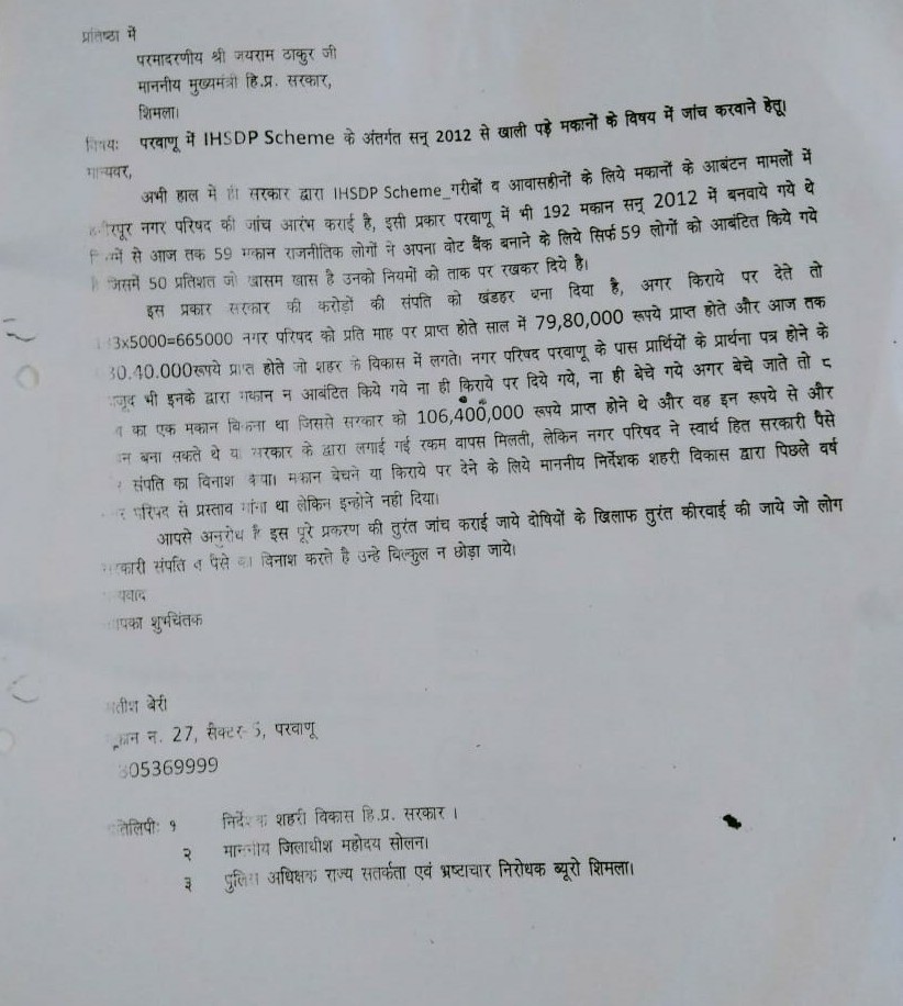 परवाणू में 2012 में सरकार द्वारा आई.एच.एस.डी.पी. स्कीम के तहत 192 मकान बनाये गए थे जो की नगर परिषद एरिया में रहने वाले गरीबों दिए जाने थे ! हैरानी की बात यह है की पिछले 9 वर्षों में नगर परिषद् परवाणू को इसके लिए केवल 59 पात्र ही मिले हैं ! यह जानकारी प्रेस विग्यप्ति द्वारा शिरडी साई बाबा भक्त संगठन के प्रदेशाध्यक्ष व् समाजसेवी सतीश बेरी ने दी ! सतीश बेरी ने कहा की नगरपरिषद की लापरवाही के चलते जनता की मेहनत का पैसा व् सरकार द्वारा इन मकानों पर खर्च किया गया करोड़ों रुपया मिटटी हो रहा है ! खाली पड़े मकान आवारा पशुओं , जुआरियों व् नशे करने वाले असमाजिक तत्वों का अड्डा बन चुके हैं ! यहाँ तक की शरारती तत्वों द्वारा मकानों में तोड़ फोड़ कर आवशयक समान भी चुरा लिया गया है ! बेरी ने बताया की उनके द्वारा माननीय मुख्यमंत्री को भी पत्र लिखकर इस मामले से अवगत कराया गया है जिसमे उन्होंने नप द्वारा सरकार को होने वाले नुक्सान का आकलन भी किया था ! उन्होंने बताया की यदि नगर परिषद द्वारा इसे किराये पर दिया जाता तो मासिक 133×5000 = 665000 रूपये व् सालाना 7980000 रूपये की आमदनी होती है ! यह पैसा हर वर्ष शहर के अन्य विकास कार्यों में लगया जा सकता है तथा यदि आज के दाम से इन्हे बेचा जाये तो 8 लाख रूपये के हिसाब से बेचा जा सकता है ! इस प्रकार नप को 800000×133 = 106400000 रूपये की प्राप्त होते हैं जो शहर के विकास व् अन्य आमदन के साधनो पर खर्च किया जा सकता है ! नप द्वारा ऐसा करने पर उन्हें सरकार से मदद की जरूरत भी नहीं पड़ेगी तथा शहर का सौन्दर्यकरण भी किया जा सकेगा ! परन्तु नगर परिषद की लापरवाही के चलते यह संसाधन व् पैसा दोनों खंडहर होते जा रहे हैं ! उन्होंने कहा की नगर परिषद को इन्हे बेचने के निर्देश 2 वर्ष पूर्व निर्देशक शहरी विकास द्वारा किये गए थे परन्तु निजी स्वार्थ के चलते तत्कालीन अध्यक्ष व् पार्षदों ने उस पर कोई अमल नहीं किया गया !