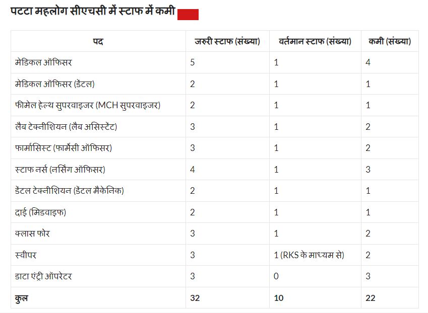 उल्लेखनीय है पटटा महलोग की सीएचसी, जो पहाड़ी क्षेत्र की लगभग 25,000 से अधिक आबादी और छह पंचायतों की स्वास्थ्य आवश्यकताओं को पूरा करती है, लेकिन लंबे समय से स्टाफ की कमी से जूझ रही है। स्थानीय निवासियों का कहना है कि सीएचसी “राम भरोसे” चल रही है, जिसके कारण क्षेत्र में स्वास्थ्य सेवाएं बुरी तरह प्रभावित हो रही हैं।