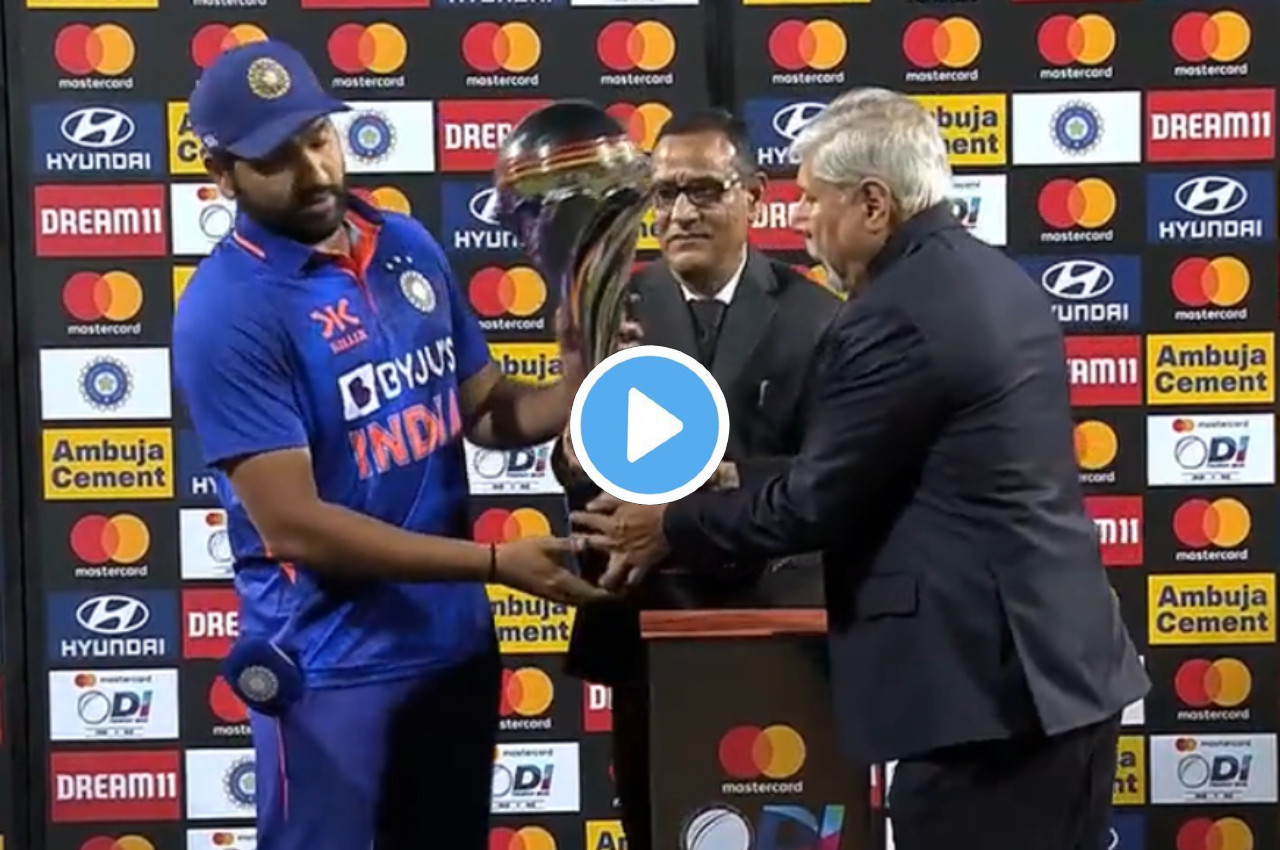 नई दिल्ली: टीम इंडिया ने न्यूजीलैंड के खिलाफ खेली गई तीन मैचों की वनडे सीरीज में कीवी टीम को 3-0 से शिकस्त देकर क्लीन स्वीप कर दिया। इंदौर में मंगलवार को खेले गए फाइनल मुकाबले में टीम इंडिया ने 90 रनों से शानदार जीत दर्ज की। इस जीत के साथ ही टीम इंडिया वनडे रैंकिंग में नंबर 1 टीम बन गई है। फाइनल में कप्तान रोहित शर्मा और शुभमन गिल ने शानदार शतक ठोका, तो दूसरी ओर शार्दुल ठाकुर, कुलदीप यादव, युजवेंद्र चहल और उमरान मलिक और हार्दिक पांड्या की शानदार गेंदबाजी ने कीवी टीम को चारों खाने चित कर दिया। हालांकि जीत के बाद जब ट्रॉफी दी गई तो कप्तान रोहित शर्मा चोट से बाल-बाल बच गए।