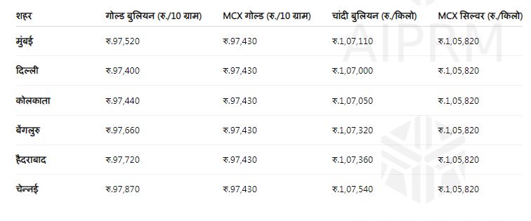 मल्टी कमोडिटी एक्सचेंज (MCX) पर 3 जुलाई सुबह 9:24 बजे तक सोना ₹97,430 प्रति 10 ग्राम था। इंडियन बुलियन एसोसिएशन (IBA) के आंकड़ों के मुताबिक सुबह 9 बजे तक 24 कैरेट सोने की कीमत ₹97,700 प्रति 10 ग्राम और 22 कैरेट सोना ₹89,558 प्रति 10 ग्राम रही।