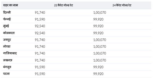 वहीं, मुंबई, चेन्नई के बुलियन मार्केट में 24 कैरेट सोने का रेट 99,900 रुपये पर है। 22 कैरेट सोने का रेट 92,700 रुपये के पार है। इसके अलावा चांदी का रेट 1,15,900 रुपये प्रति किलोग्राम पर ट्रेड कर रहा है। जानिये देश के बड़े शहरों की बुलियन मार्केट में आज 28 जुलाई का सोने-चांदी का भाव क्या रहा।
