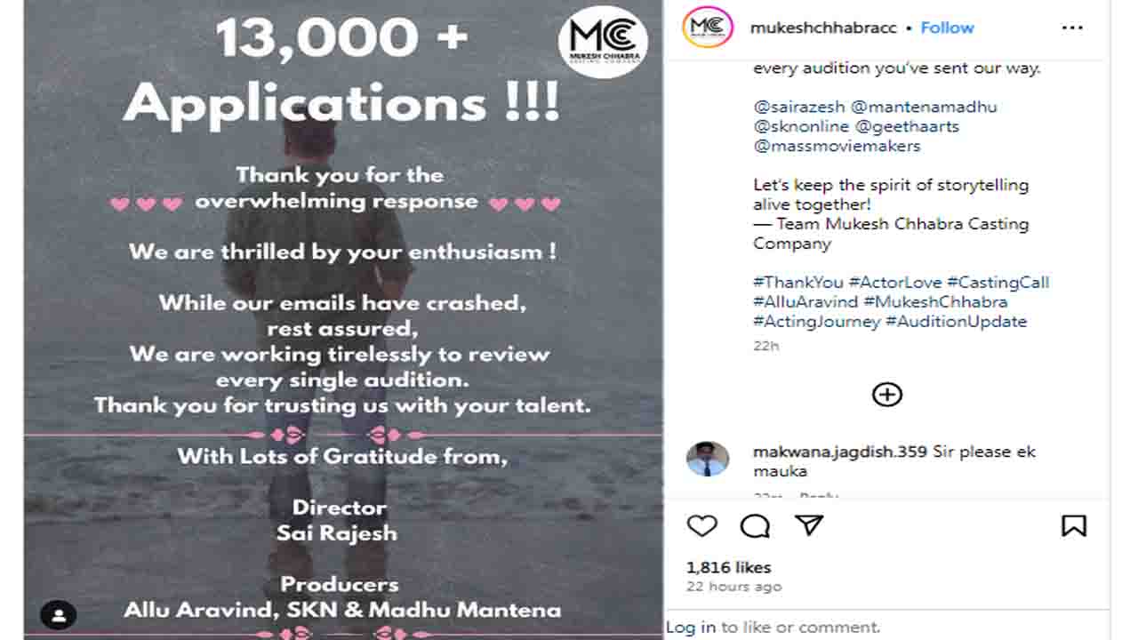 ENTERTAINMENT NEWS: साई राजेश की आगामी फिल्म के लिए मुकेश छाबड़ा को मिली 13,000 से अधिक एंट्रीज!
