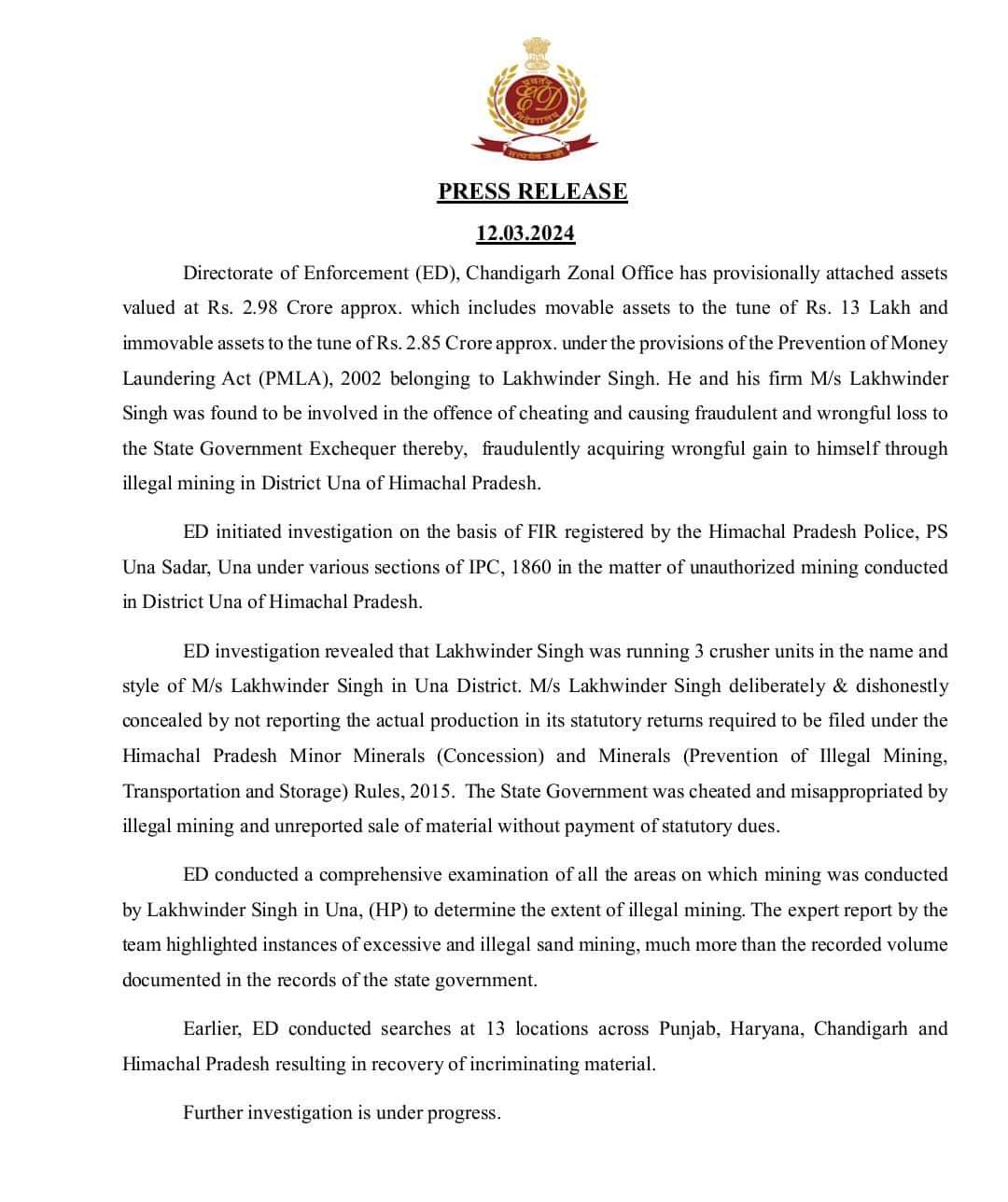 ईडी ने हिमाचल प्रदेश के जिला ऊना में किए गए अनधिकृत खनन के मामले में आईपीसी, 1860 की विभिन्न धाराओं के तहत पुलिस थाना ऊना सदर द्वारा दर्ज की गई एफआईआर के आधार पर जांच शुरू की। जांच में पता चला कि लखविंदर सिंह ऊना जिले में मेसर्स लखविंदर सिंह के नाम से तीन क्रशर इकाइयां चला रहा था। आरोप के मुताबिक, उसने जानबूझकर और बेइमानी से हिमाचल प्रदेश माइनर मिनरल्स (रियायत) और खनिज (अवैध खनन, परिवहन और भंडारण की रोकथाम) नियम, 2015 के तहत दाखिल किए जाने वाले अपने वैधानिक रिटर्न में वास्तविक उत्पादन की रिपोर्ट को छुपाया। वैधानिक बकाया के भुगतान के बिना अवैध खनन और सामग्री की अघोषित बिक्री से सरकार को धोखा दिया गया और उसका दुरुपयोग किया गया।