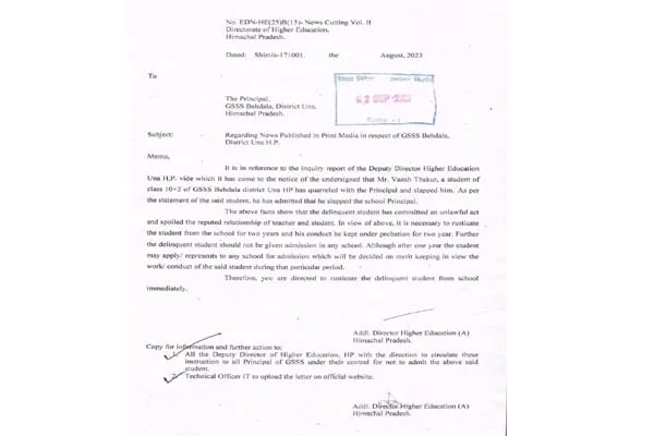 UNA News : प्रधानाचार्य को थप्पड़ मारने वाले छात्र को 2 साल के लिए स्कूल से निकालने की अधिसूचना